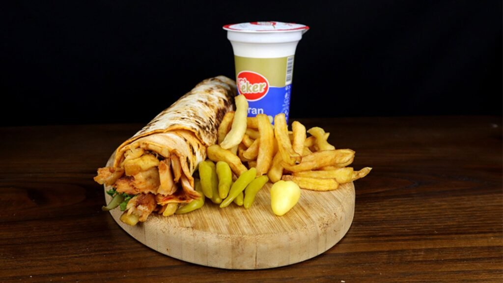 | Tavuk Şiş Dürüm Menü Im Brot mit Salat, Pommes und Ayran (hausgemacht) |