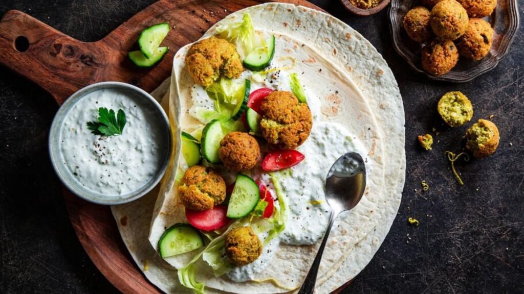 | Falafel Dürüm Menü Mit Salat, Pommes und Ayran (hausgemacht) |